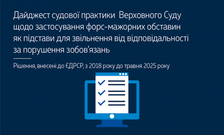 Пропонуємо до вашої уваги дайджест судової практики Верховного Суду щодо застосування форс-мажорних обставин як підстави для звільнення від відповідальності за порушення зобов’язань (рішення, внесені до ЄДРСР, з 2018 року до травня 2025 року) – https://court.gov.ua/storage/portal/supreme/ogliady/Daigest_VS_fors_mazhor.pdf.